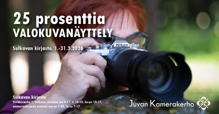 25 prosenttia – Juvan Kamerakerhon jäsenten valokuvia esillä 1.–31.3.2026 Sulkavan kirjastossa Tilastokeskuksen tutkimusten mukaan valokuvaus on Suomen ylivoimaisesti suosituin luova harrastus. Kun neljännes yli kymmenvuotiaista kertoo ottavansa valokuvia harrastuksenaan, tarkoittaa se käytännössä, että yli miljoona suomalaista valokuvaa! Jokaisella ihmisellä on…